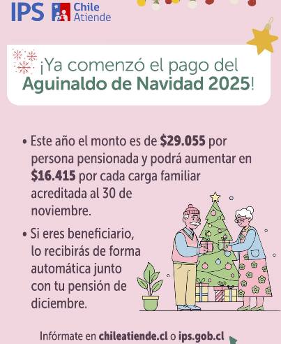 Para información general del aguinaldo, están disponibles los sitios www.ips.gob.cl, www.chileatiende.cl, Call Center 101 o 600 440 0040, redes sociales @ChileAtiende en X, Facebook e Instagram y las sucursales ChileAtiende del IPS en todo el país.