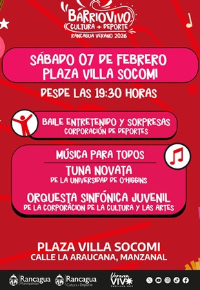 En tanto, el sábado 7, Barrio Vivo llegará a Plaza Villa Socomi, en calle La Araucana, sector Manzanal, desde las 19:30 horas. En esta jornada, se presentarán la Tuna Novata de la Universidad de O’Higgins y la Orquesta Sinfónica Juvenil de la Corporación de la Cultura y las Artes, junto a actividades de baile y entretención lideradas por la Corporación de Deportes.