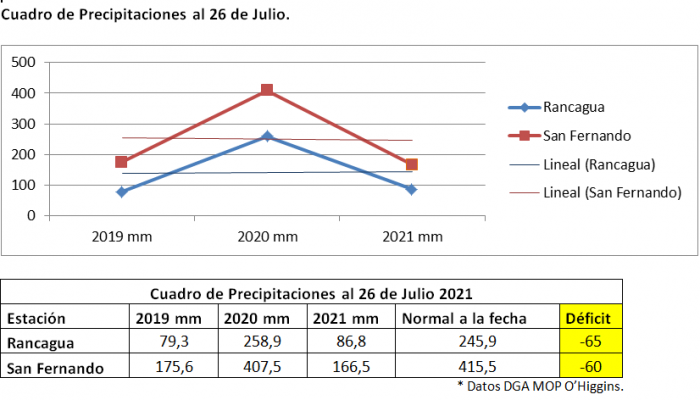 Días de intenso frío con temperaturas mínimas bajo cero, así como jornadas casi primaverales, han marcado la agenda climática de este invierno en la región de O´Higgins, pero las lluvias han sido las grandes ausentes y la situación, ya iniciado el mes de agosto, es cada día más preocupante en ciudades como Rancagua en las que solo se registran 86.8 mm de agua lluvia acumulada en lo que va del presente año y de eso, el 70% lo dejó una inusual precipitación registrada en el mes de enero. Lo normal para esta fecha son 245.9 mm aquí en la zona, por lo que el déficit supera ya el 65% en la capital regional, mientras que el déficit en San Fernando se eleva por sobre el 60%.