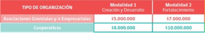 Según el tipo de organización y la modalidad de postulación los montos del subsidio de SERCOTEC son: