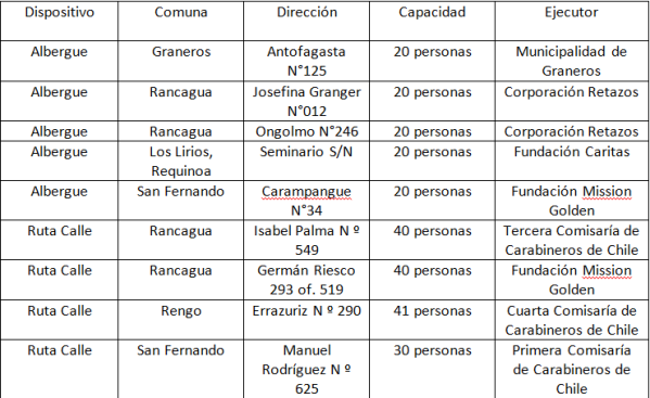 Los cinco albergues habilitados en nuestra Región para las personas en situación de calle y las rutas calles, que se ejecutan junto al municipio de Graneros, Carabineros de Chile, Corporación Retazos, Fundación Caritas y Mission Golden, se encuentran en las siguientes comunas: