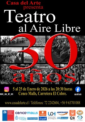 Teatro Casa del Arte, en colaboración con la Corporación de la Cultura y las Artes de la Ilustre Municipalidad de Rancagua, anuncian el regreso a Rancagua del Festival de Teatro al Aire Libre, en su versión N°30. La actividad se llevará a cabo entre los días 5 y 25 de enero de 2026, a las 20:30 horas, en la tradicional “carpa teatro” ubicada en el estacionamiento de Cenco Malls, ex Portal Rancagua.