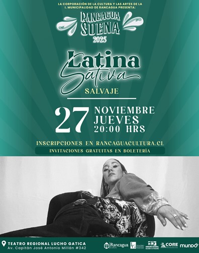 La tercera edición de Rancagua Suena 2025, iniciativa de la Corporación de la Cultura y las Artes de la Ilustre Municipalidad de Rancagua, presentará a la artista local Latina Sativa, quien llegará al escenario del Teatro Regional Lucho Gatica con “Salvaje”, un álbum que explora la identidad, la emocionalidad y la fuerza femenina a través de una mezcla de rap, ritmos afro y sonoridades latinas.