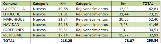 En este contexto, las comunas de Litueche y La Estrella encabezan un avance considerable de inversión en conectividad rural concretada en la región, en caminos nuevos y rejuvenecimiento de caminos que se aprecia en la tabla: