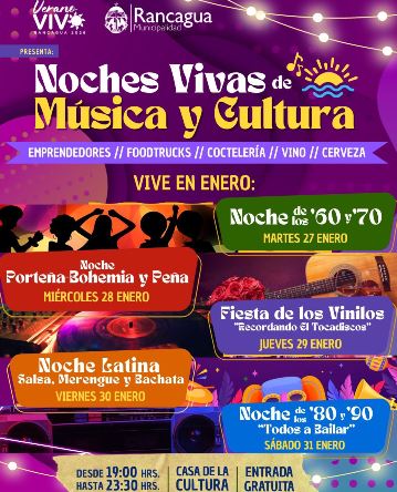 La Municipalidad de Rancagua, en el marco del programa Verano Vivo Rancagua 2026, invita a la comunidad a participar de “Noches Vivas de Música y Cultura”, una atractiva cartelera de panoramas nocturnos que se desarrollará durante la última semana de enero en la Casa de la Cultura, con entrada totalmente gratuita.